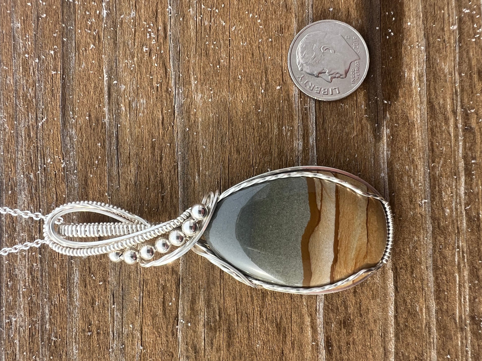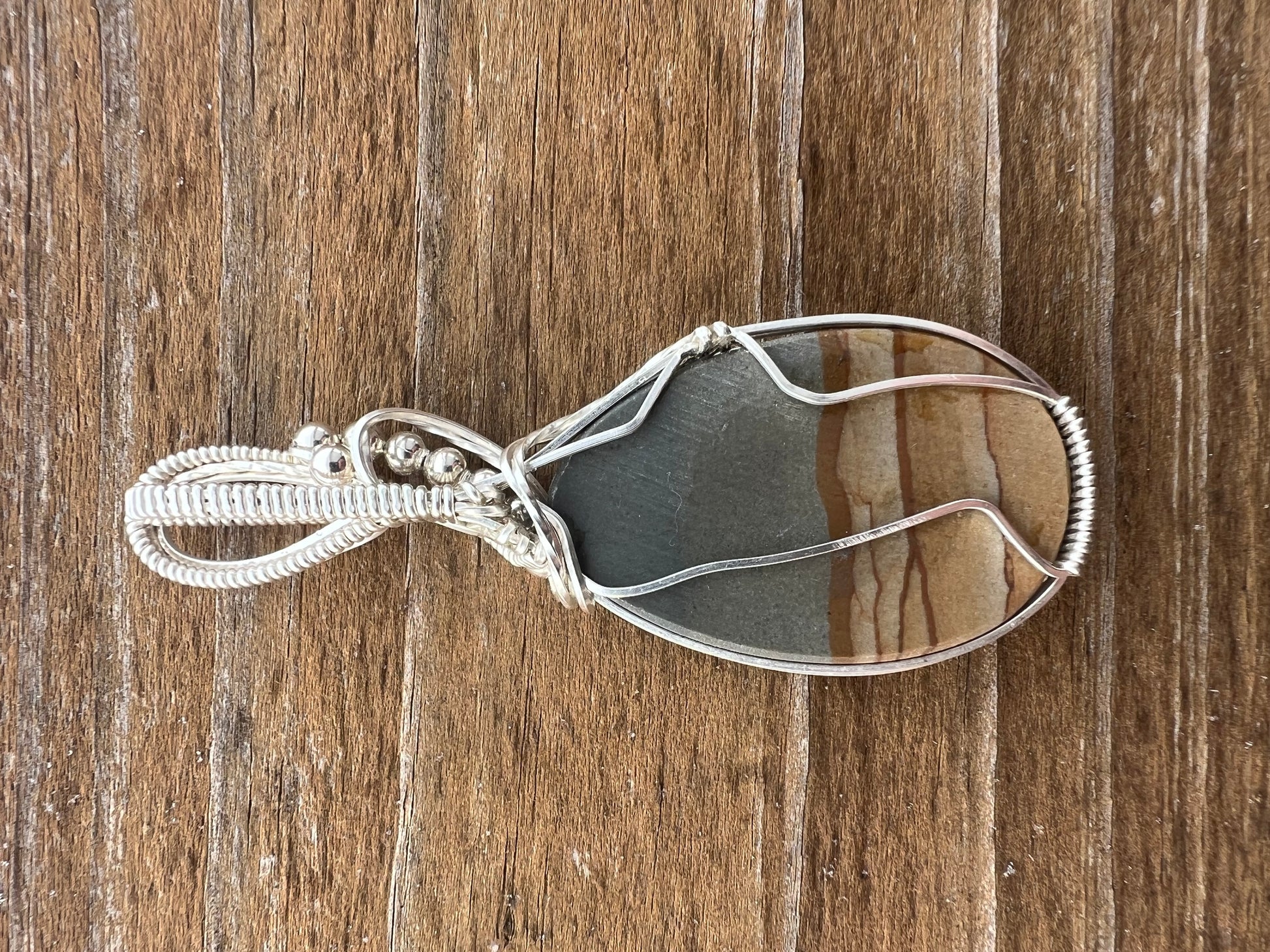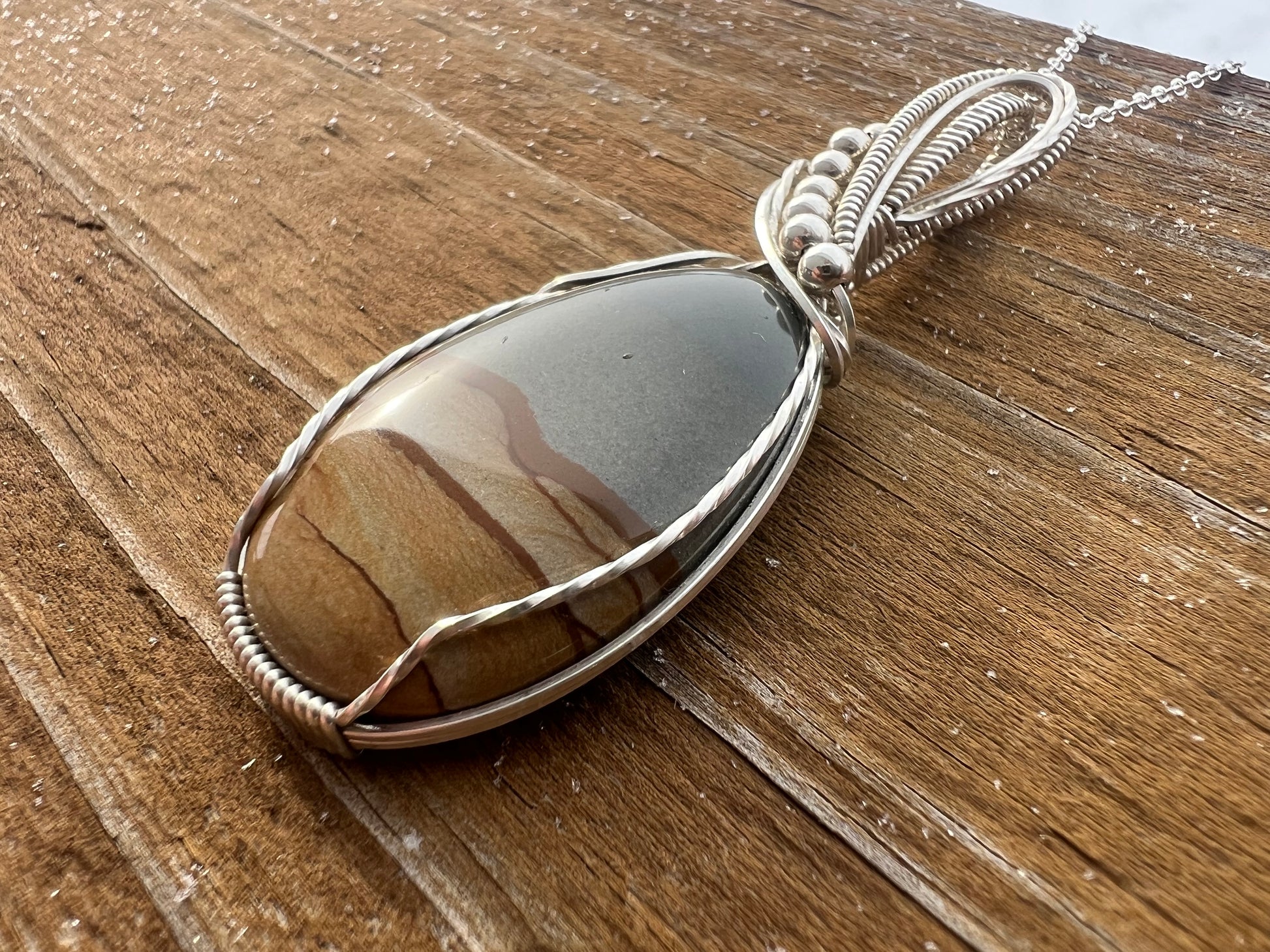 All cabochons are hand cut from rough stones by myself, as well as the wire wrapping, which is done in .940 Agrentium Silver.