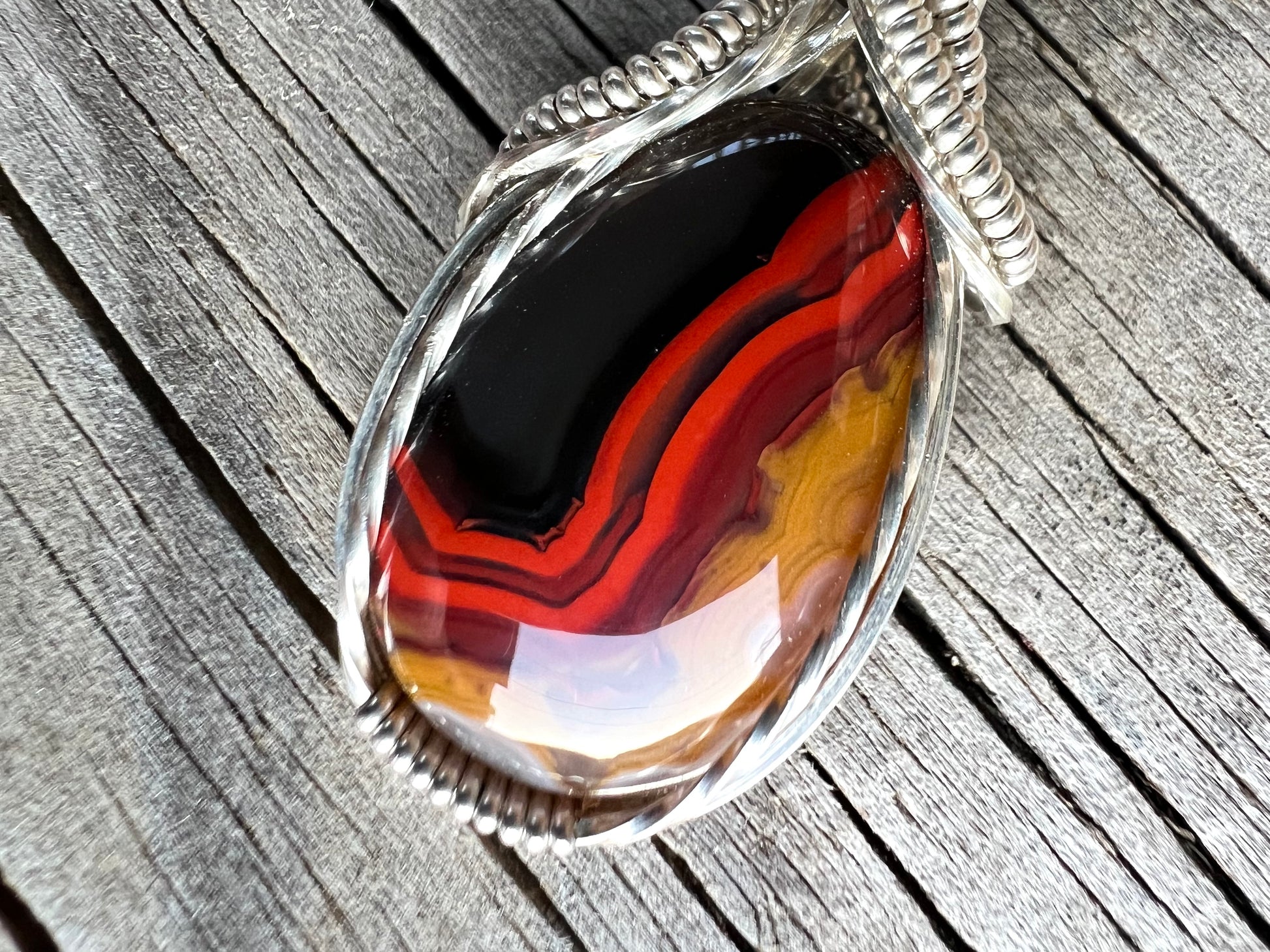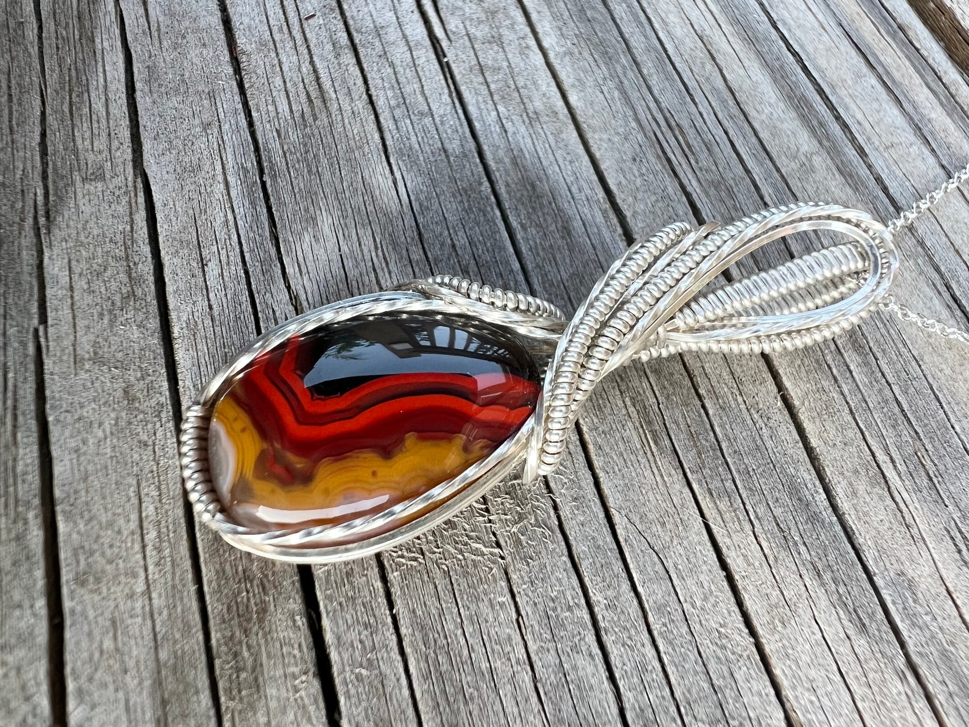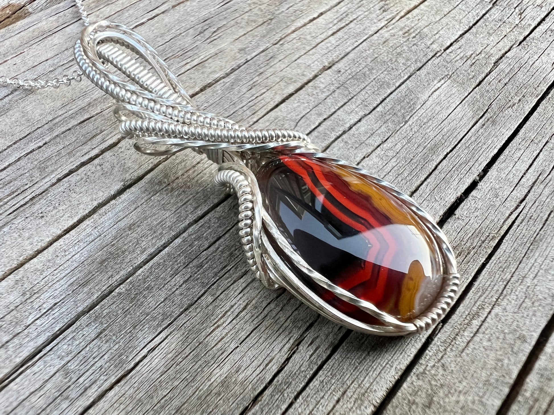 This piece, the “Kentucky Queen”, is made of the highest quality Kentucky agate I’ve personally seen. The color saturation is incredible, and the stone took an amazing polish. This stone was wrapped in Argentium silver.