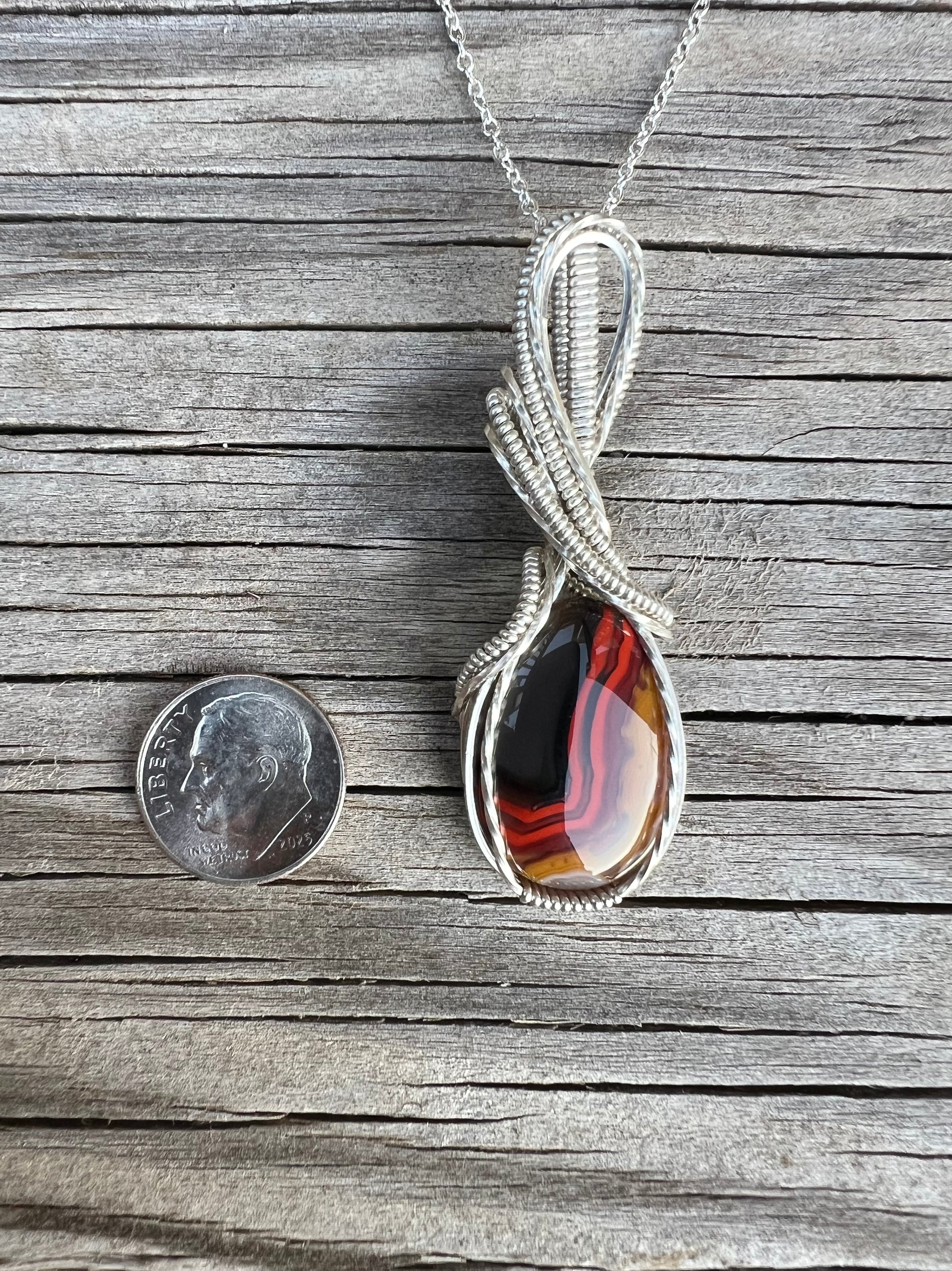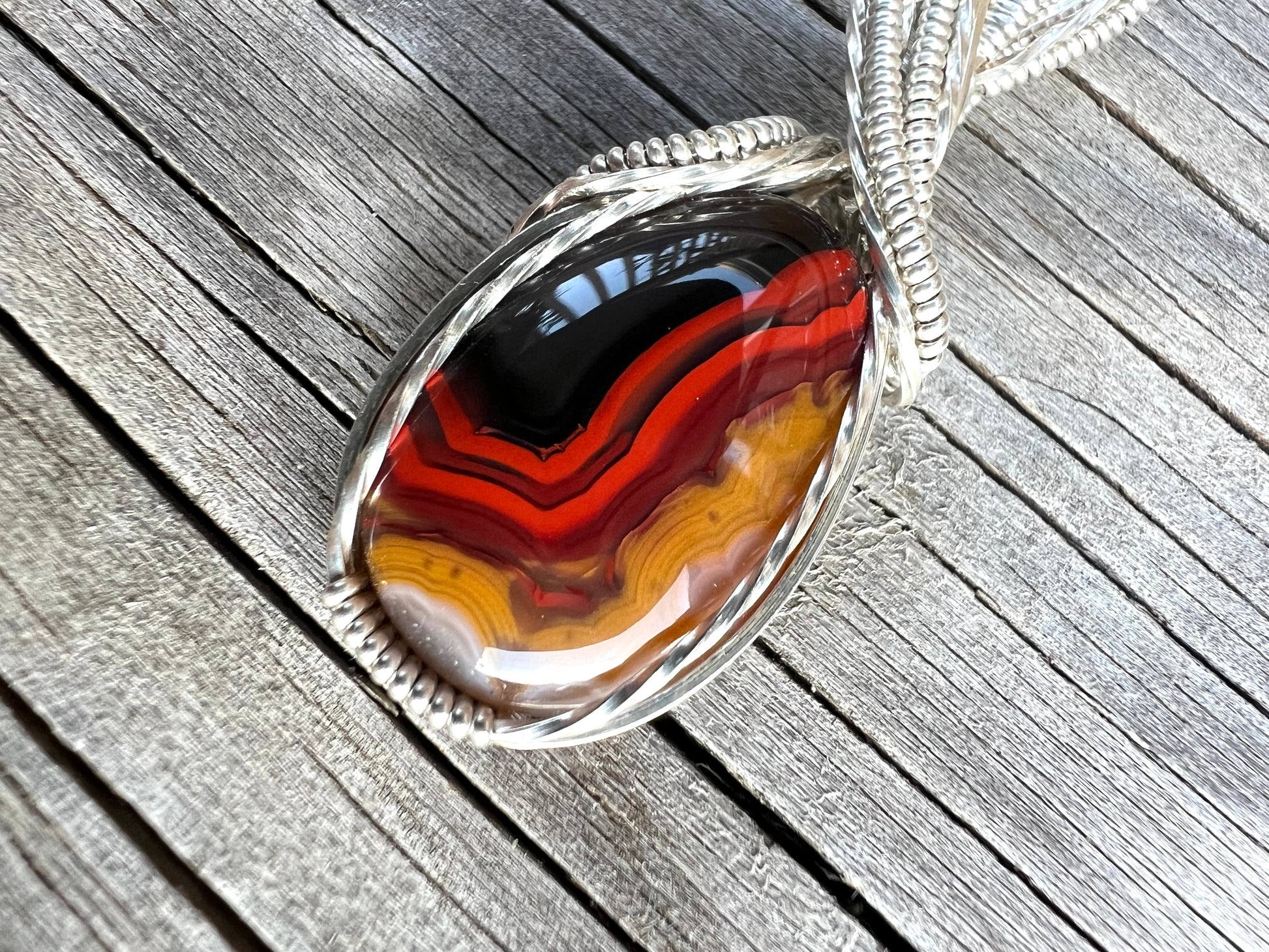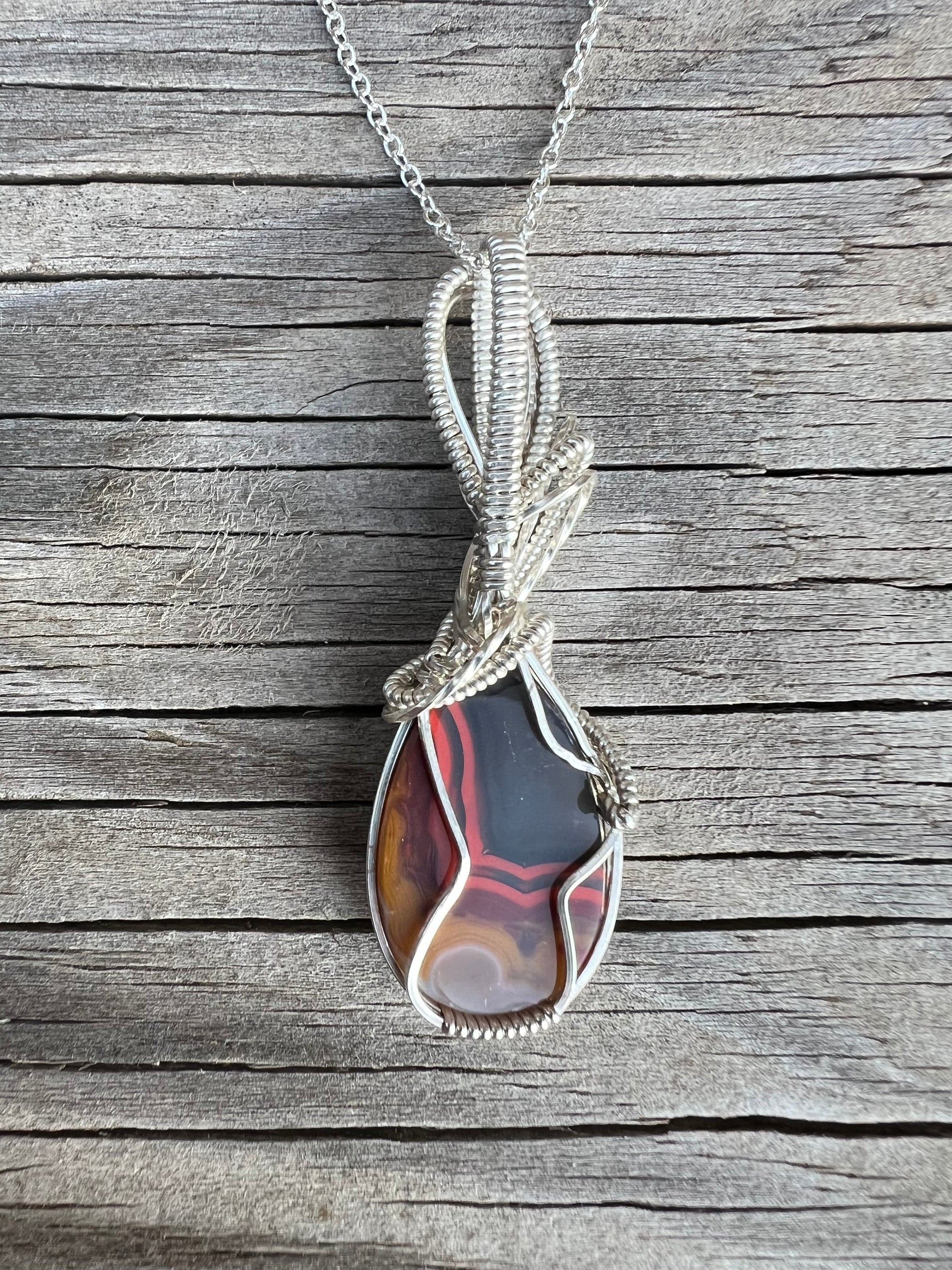 This piece, the “Kentucky Queen”, is made of the highest quality Kentucky agate I’ve personally seen. The color saturation is incredible, and the stone took an amazing polish. This stone was wrapped in Argentium silver.